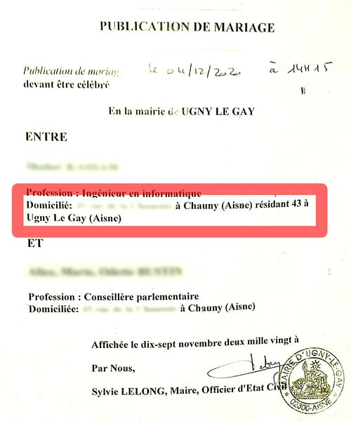 La publication de mariage ne mentionne pas de rue pour le lieu de résidence… Et qui plus est, force est de constater